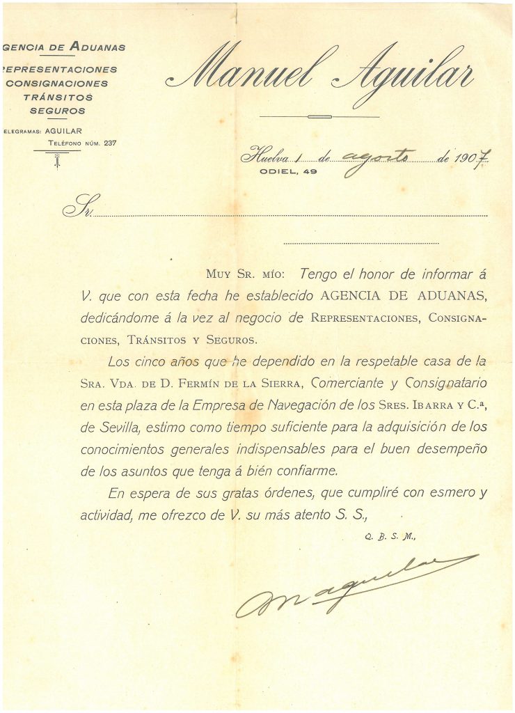 Olmae es una agencia de aduanas heredera de Manuel Aguilar fundador de la primera agencia el 1 de agosto de 1907. Somos la cuarta generación de representantes aduaneros en Huelva.